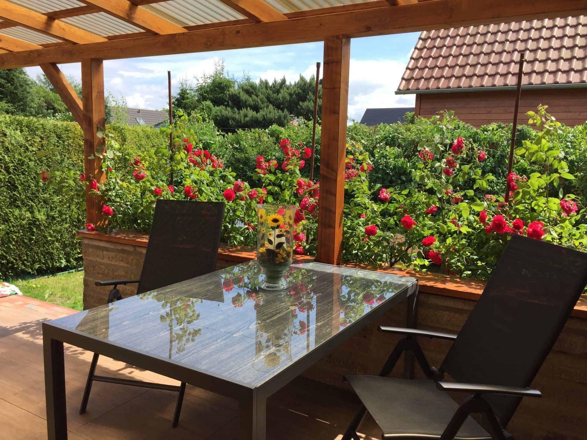 Unser Häuschen ist mit allem sehr wohnlich ausgestattet, was Sie für Ihre Urlaubstage benötigen. Der gemütliche Kamin und die Fußbodenheizung sorgen auch an kühleren Tagen für warme Behaglichkeit. Besonders stolz sind wir auf unsere große, überdachte Terrasse – Sie werden sich bei uns wohl fühlen! Da der Garten rundum eingezäunt ist, sind Haustiere bei uns auch herzlich willkommen! Auf der Terrasse und im Garten kann selbstverständlich geraucht werden!